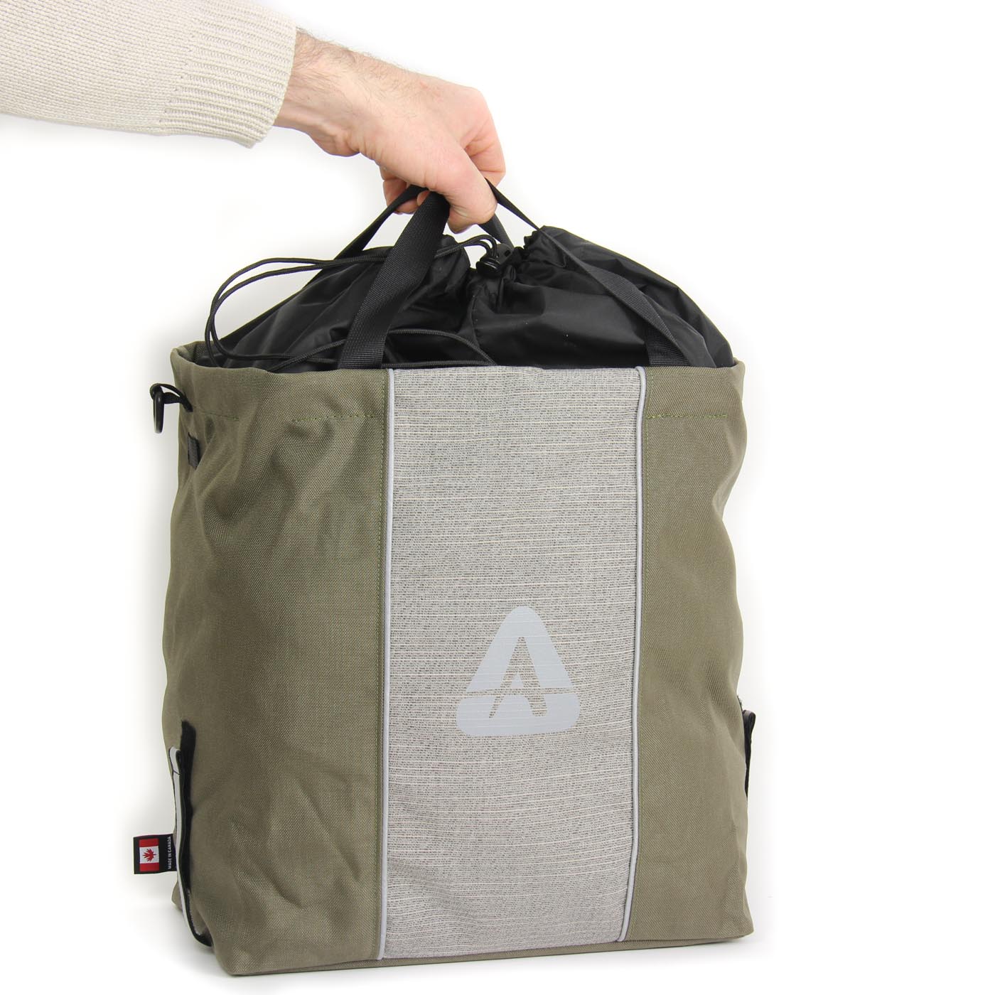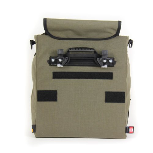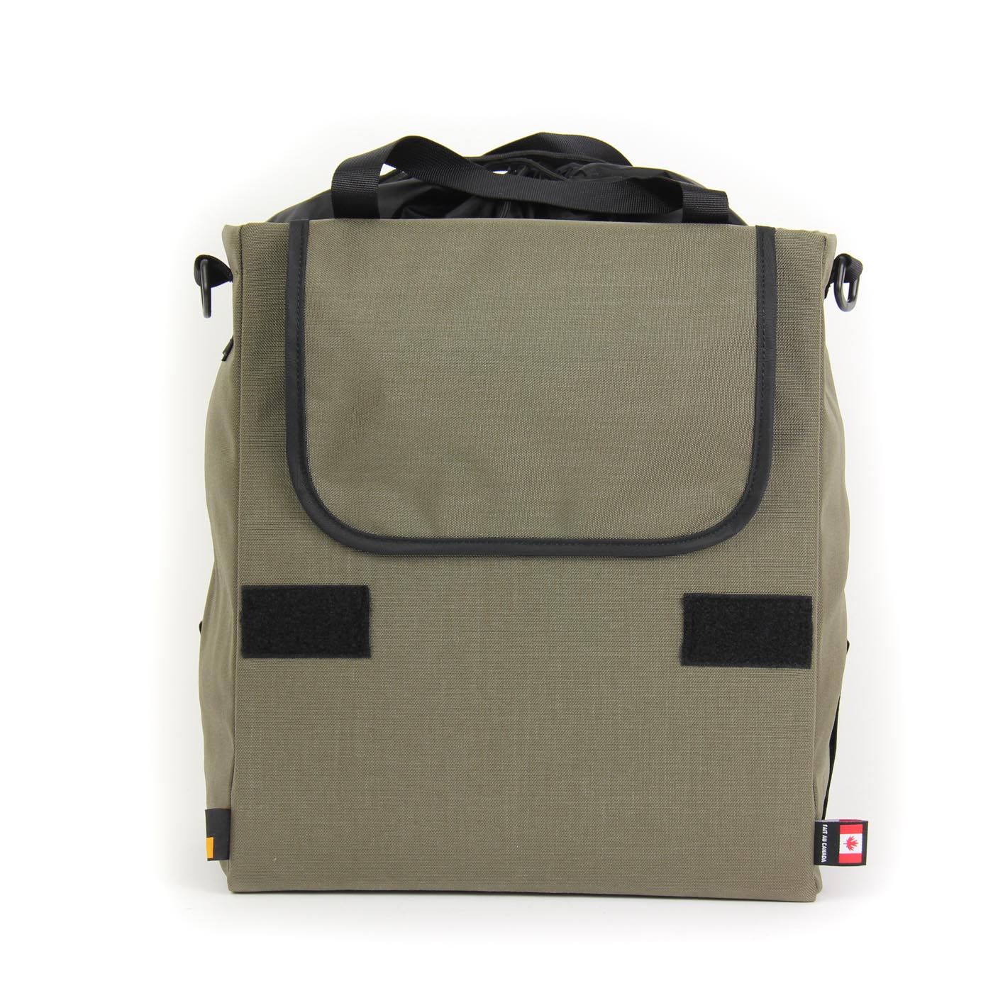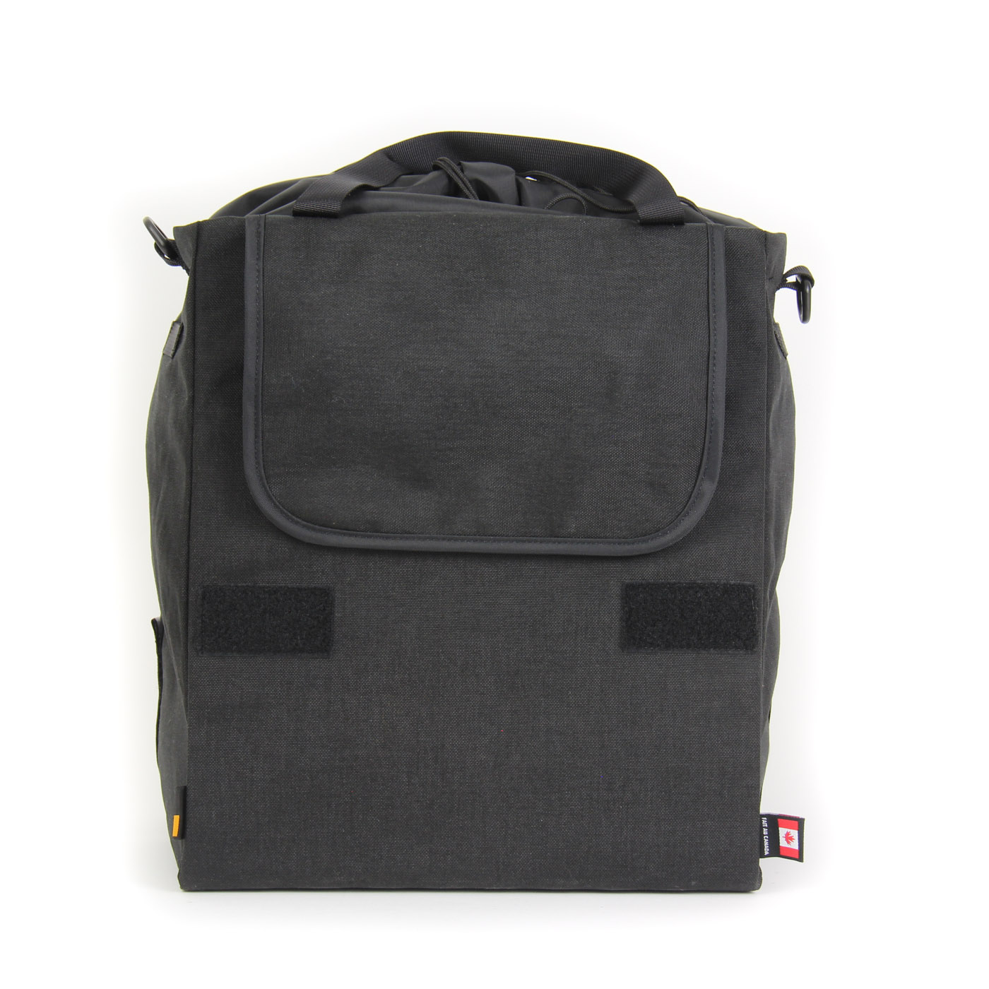 Folds tight against your rack when not in use. A drawstring sleeve extends its already spacious 1525 cubic inch capacity to 1768 cubic inches. In order to streamline this pannier and make it easier to use in an urban environment, we removed the lower hook and bungee normally included in the Cam-Lock® mounting system.