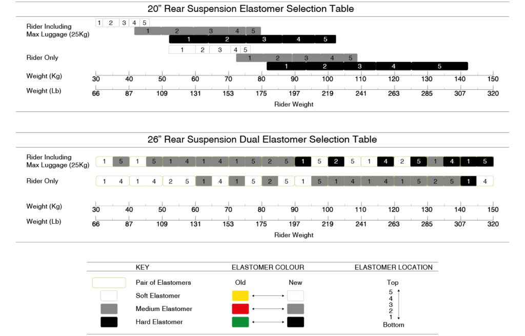 Pick the correct firmness for your weight. See chart below. Trikes with 20" rear wheels use one elastomer. Trikes with 26" or 700c rear wheels use two.