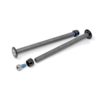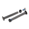 Front wheel axle bolt for disc brake wheels (too short for drum brakes) made from high strength steel. Includes black anodized bolt cap and black anodized bolt bushing. Cap and bolt are also available separately if you happen to loose those.